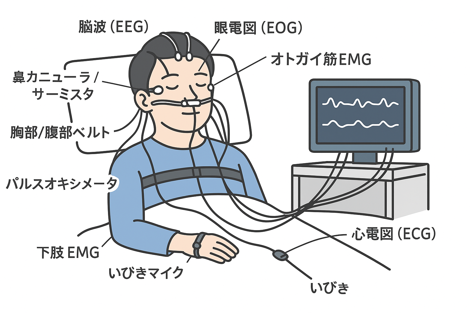これは一晩かけて行う精密な検査で、患者が寝ている間の呼吸状態、脳波、筋電図、心電図、眼球運動、血中酸素飽和度などを詳細にモニタリングします。
