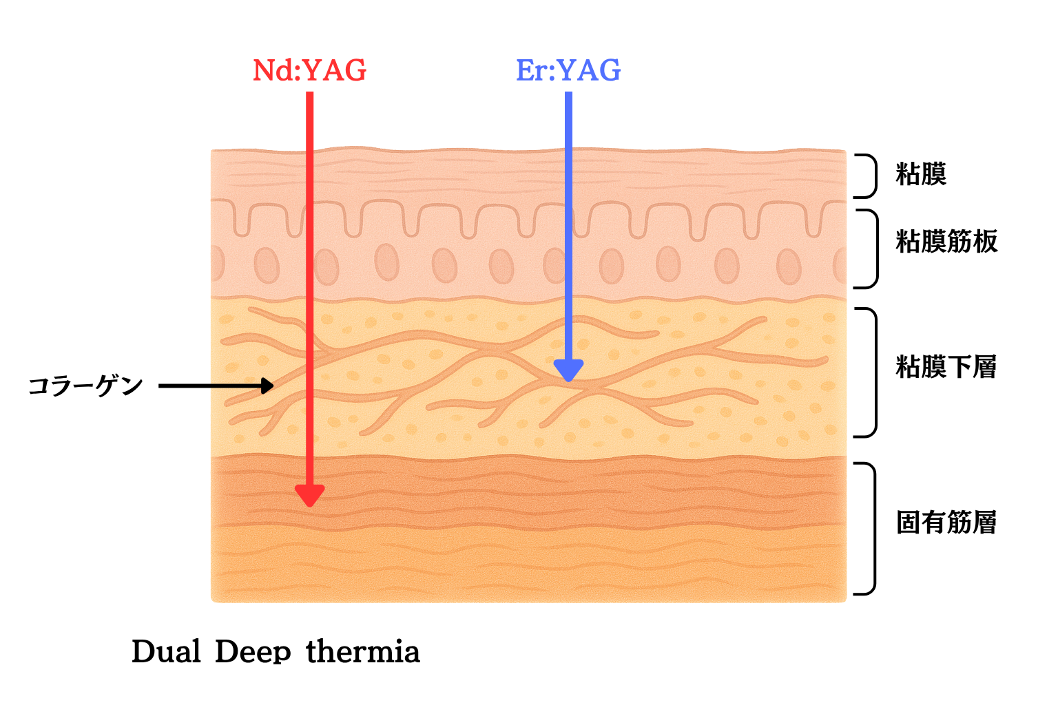 Er:YAGレーザーは2940nm赤外線レーザーで水に非常によく吸収され、粘膜表層で熱がすばやく立ち上がる一方、組織深部への余計なダメージは最小限に抑えられる。Dual Deep Thermiaでは独自のSMOOTH®モードという発振様式を用い、表皮を焦がさない程度のサブアブレイティブ(非蒸散)加熱を断続的に与えます。