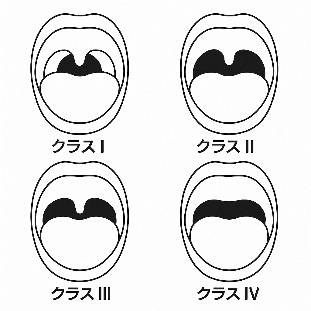 の口腔・咽頭(軟口蓋の厚み・口蓋垂の長さ・口峡の狭さ、Mallampati分類)、舌(歯圧痕=巨舌のサイン)