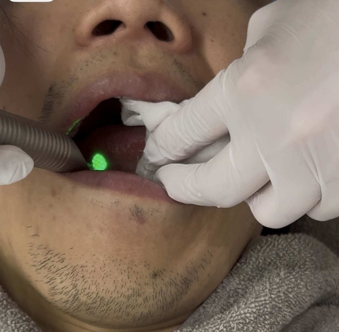 上野いびきクリニックでは舌によるいびき治療の観点から舌用のタイトニングレーザーを用いて舌用の周波数と波長を調整し舌の筋力上昇とコラーゲン増生を狙って治療を行っています。