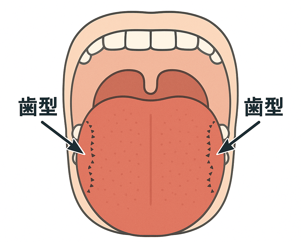 舌が相対的に大きい(=顎や歯列に対して舌の体積が勝っている)と、仰向けで舌根が後方へ沈下しやすく、気道が狭くなりやすいです。セルフチェックとして有用なのが「舌の両サイドの歯型(ギザギザ)」です。鏡で舌の側面を見て、歯型がくっきり付いている場合、舌が大きい(相対的巨舌)、歯列が狭い(舌の逃げ場が少ない)、噛みしめ・歯ぎしりで舌が押し付けられているなどが重なっている可能性があります。