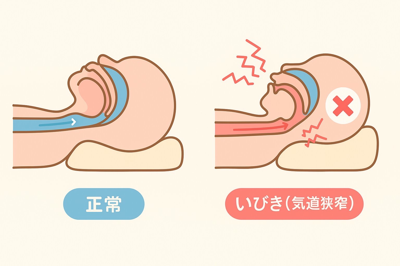 睡眠時にこの軟口蓋が重力や筋弛緩(筋肉のゆるみ)により喉の方へ垂れ下がると、**気道が狭くなり、呼吸によって振動して「いびき音」**を発生させます。特に肥満や加齢によりこの部位が厚くなると、いびきのリスクが高まります。