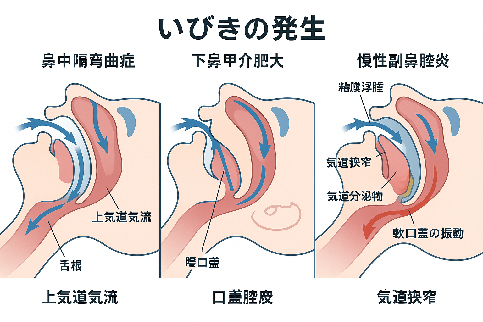 アレルギー性炎症や喫煙などにより、声門の周囲が慢性的に炎症・浮腫して狭くなることで、空気の通過が乱れ、いびき音が発生します。